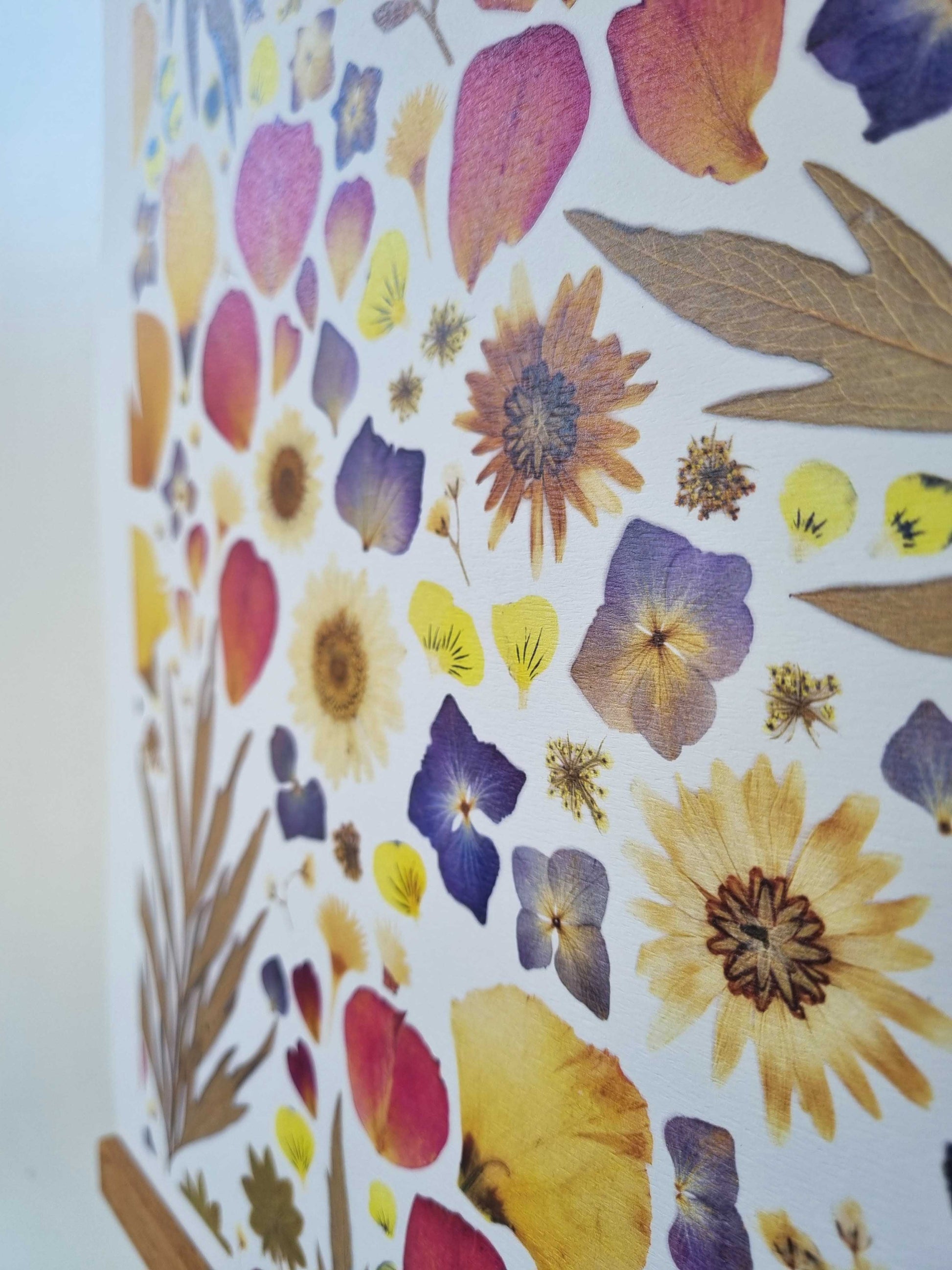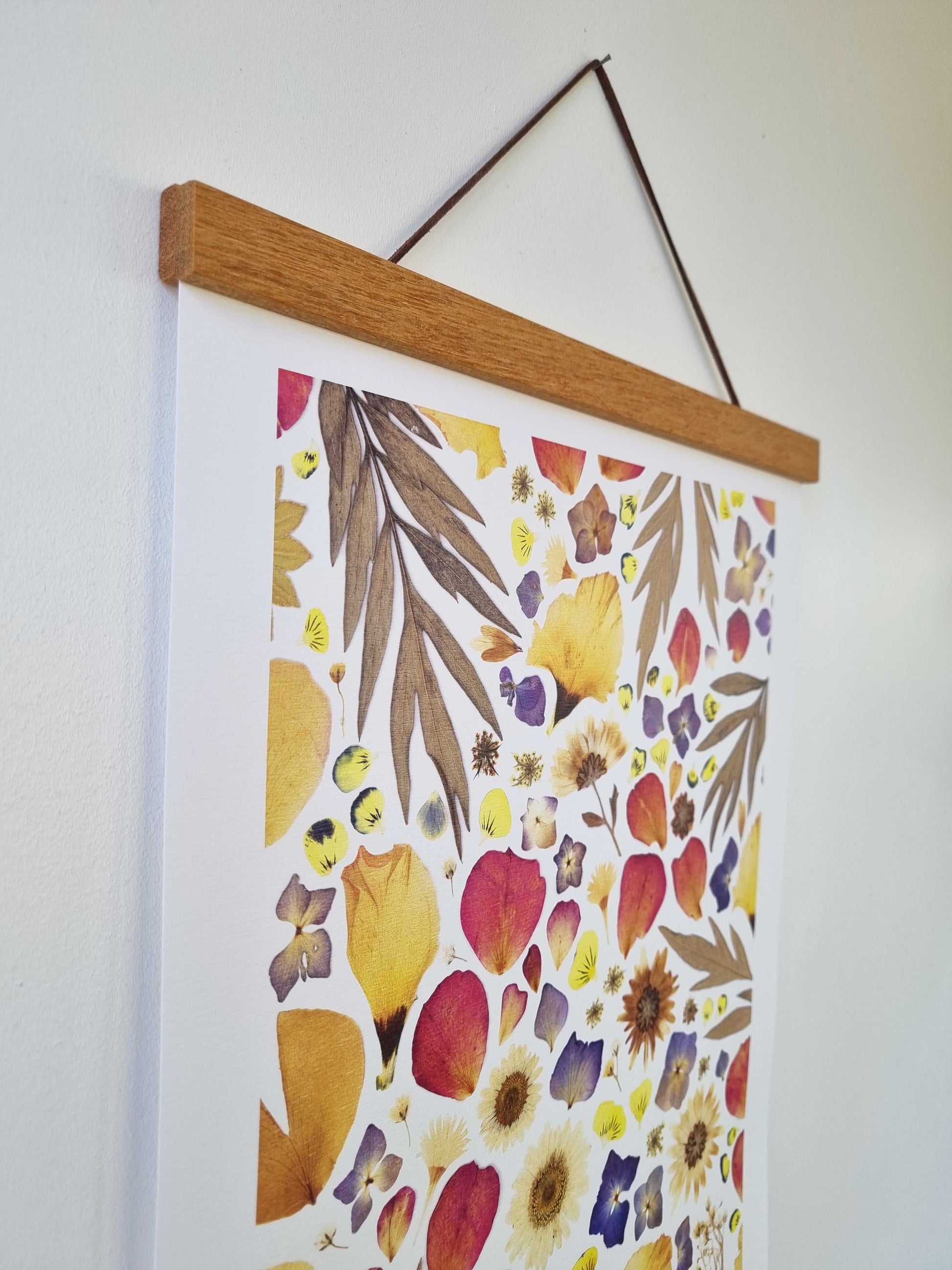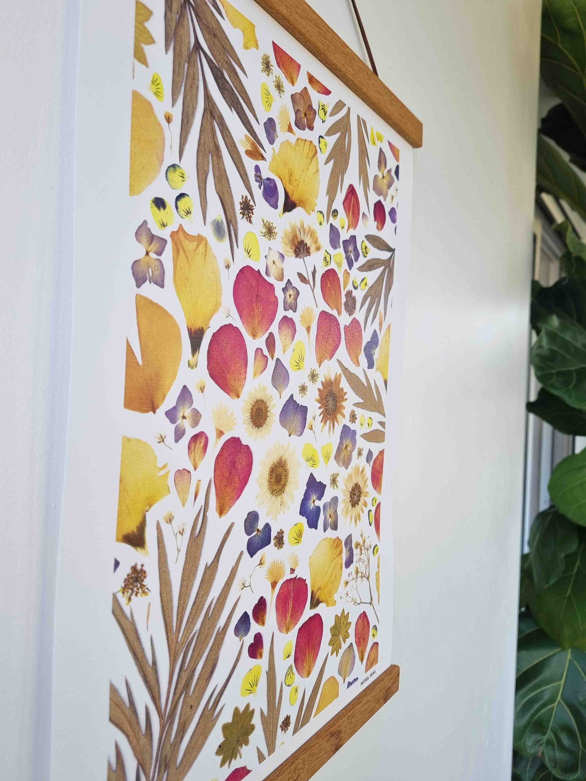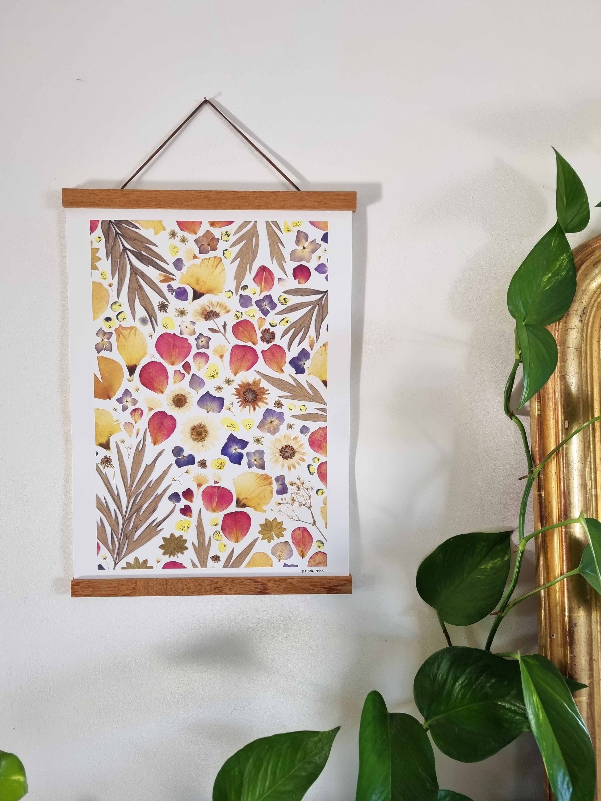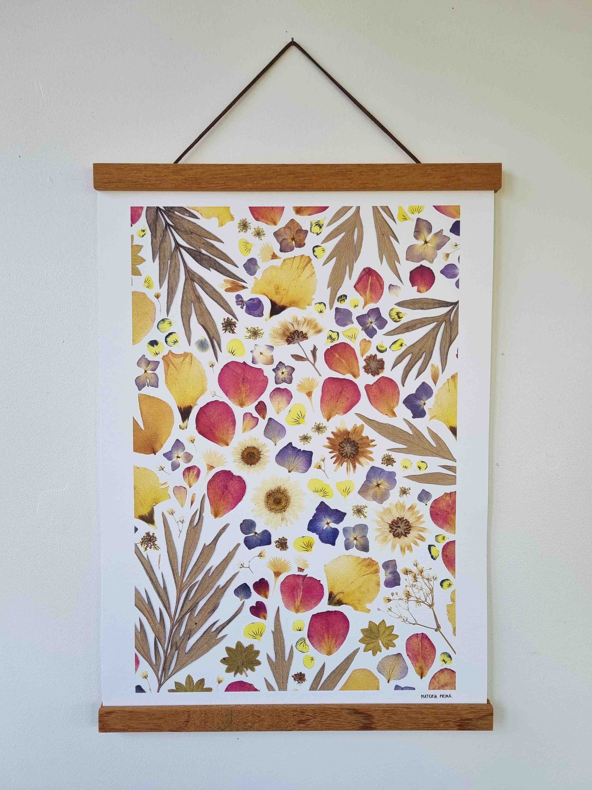 L'affiche est une reproduction d’un herbier original et unique, composé de pétales de fleurs séchées et de feuillage.