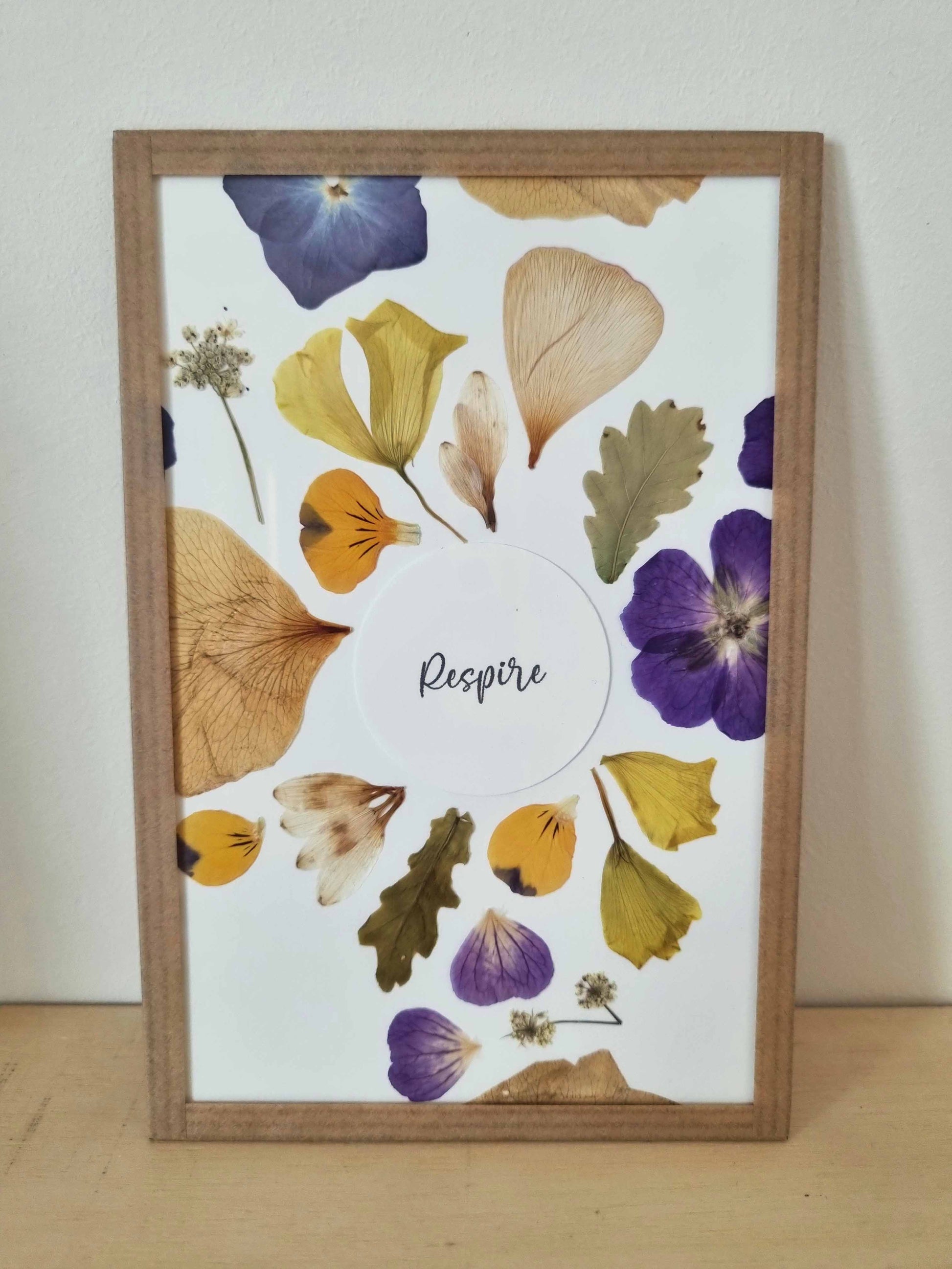 Il est composé de fleurs et de feuilles récoltées, pour la plupart, dans mon jardin ou lors de mes balades. Les fleurs sont séchées à la main par pressage, pétale par pétale durant 1 à 6 semaines.