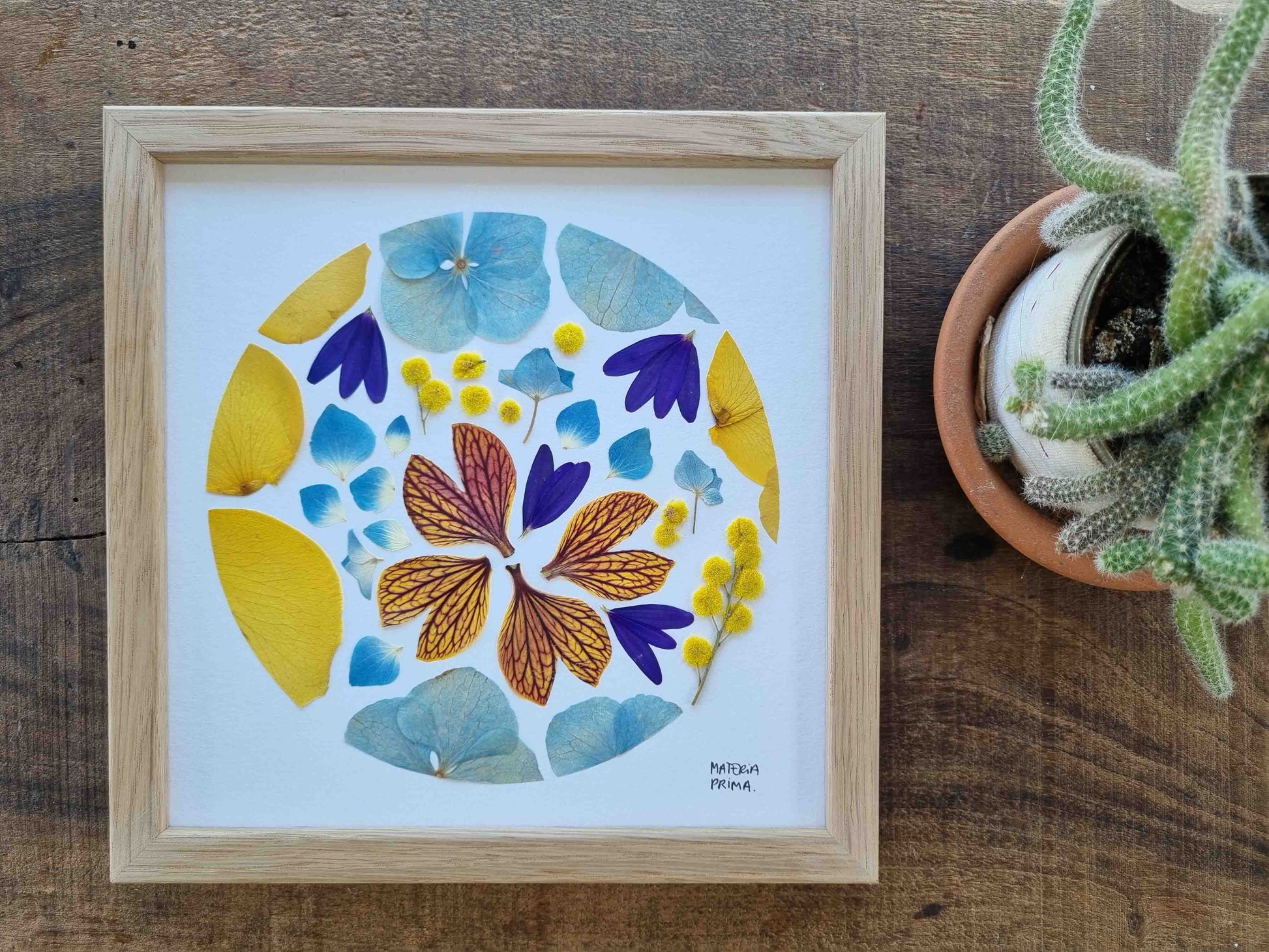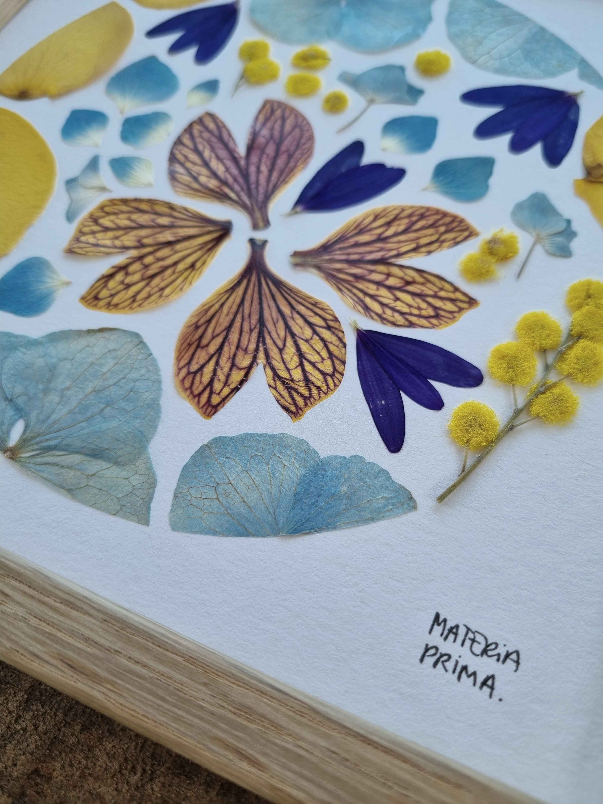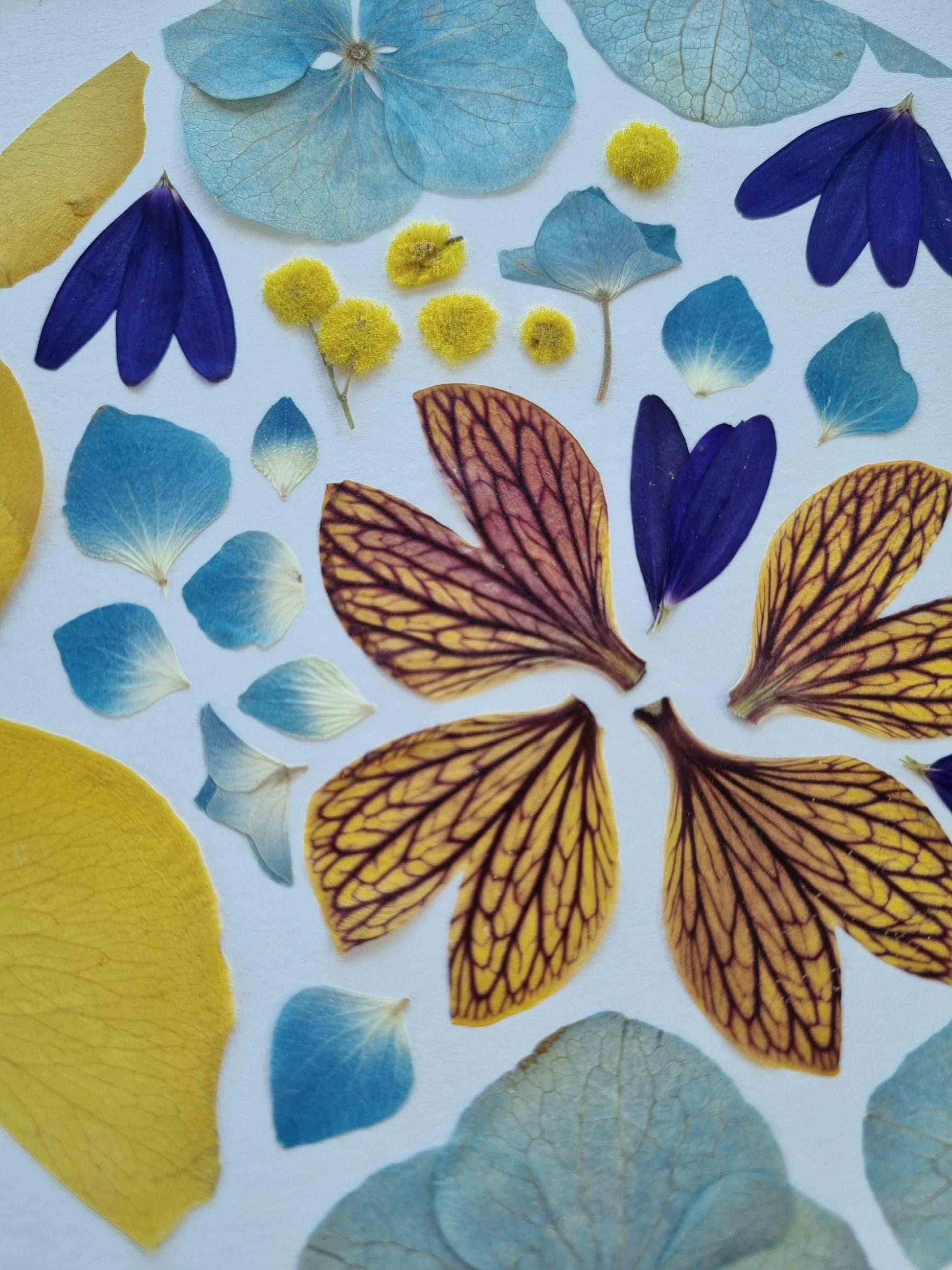 Il est composé de fleurs et de feuilles récoltées lors de mes balades ou cultivées dans mon jardin pour la plupart. Les fleurs sont séchées à la main par pressage, pétale par pétale durant 1 à 6 semaines.